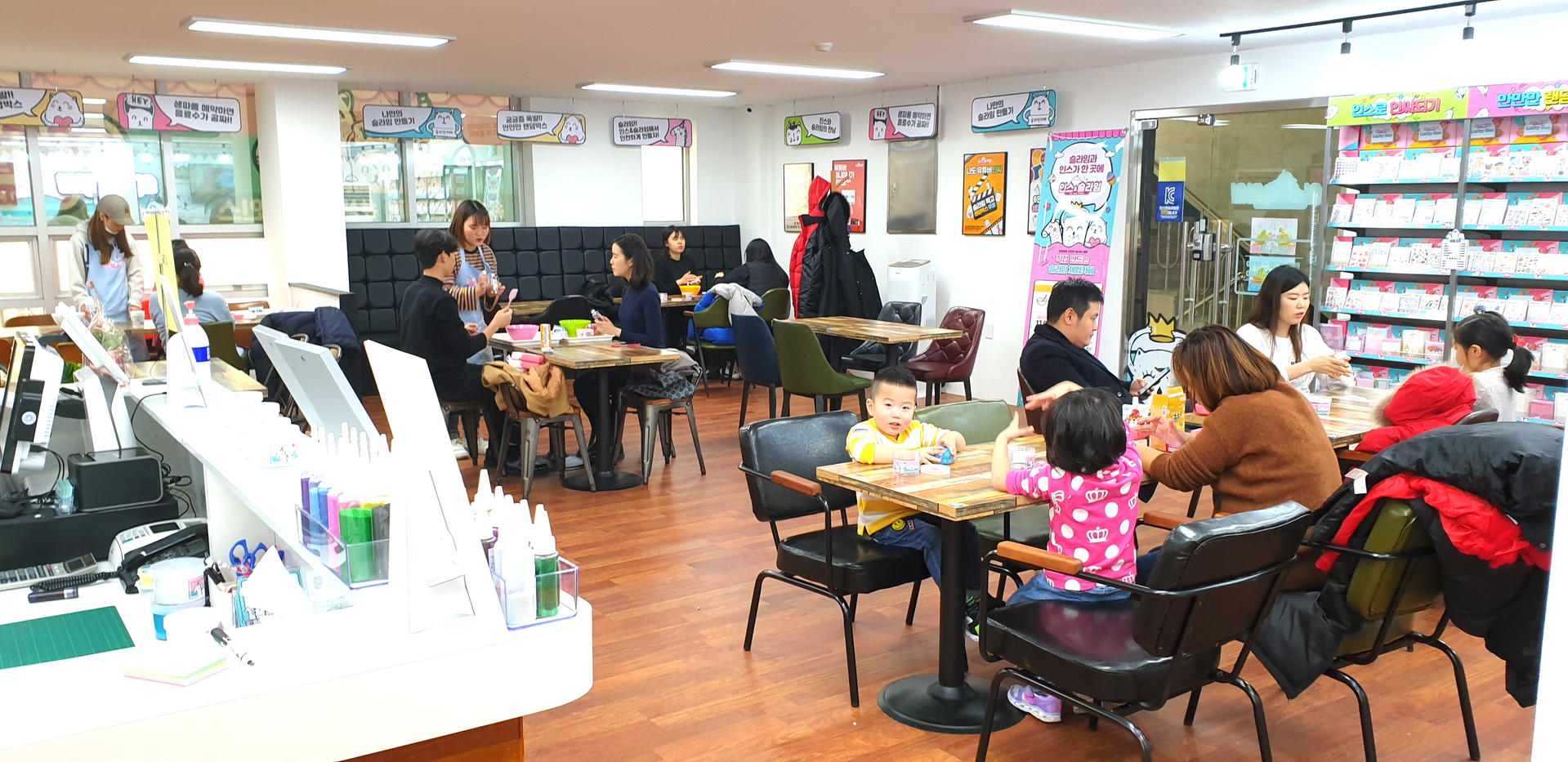 또한 인스앤슬라임에서는 핸드폰 케이스 꾸미기(일명 '폰꾸')와 젤리가방 만들기 등의 체험도 할 수 있고, 요즈음 아이들 사이에서 유행하고 있는 '마리모키우기'와 창의력 성장을 위한 그림 그리기 등의 다채로운 체험 활동도 즐길 수 있다. 또한 최근 유행하고 있는 인스(인쇄소 스티커), 판스(판 스티커), 떡메(뜯어쓰는 메모지), 래핑(포장지), 마테(마스킹 테이프), 도무송, 스티커북도 함께 판매하고 있어, 직접 고른 스티커로 다양한 메모지나 노트, 포장지, 스티커북 등을 꾸밀 수 있다.